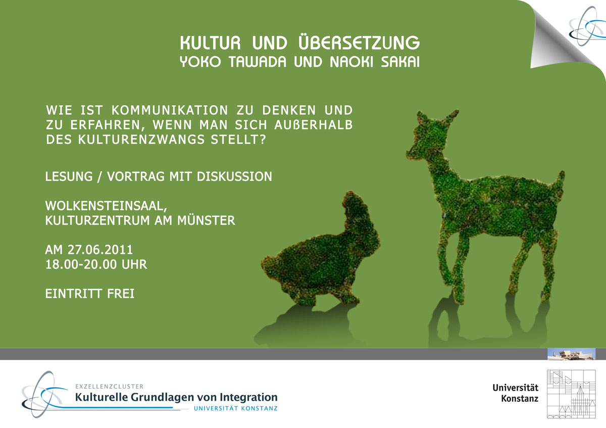Ob es sich um den vielbeschworenen „Dialog der Kulturen” handelt oder um Diskussionen in Bezug auf Inter- und Transkulturalität: Der Begriff der Übersetzung ist zu einer „Meta-Metapher“ geworden, wenn es um „Probleme der Verständigung“ geht. Gleichzeitig zieht Übersetzung Grenzen und Hierarchien. Die Schriftstellerin Yoko Tawada, die u.a. 2005 mit der Goethe Medaille ausgezeichnet wurde, und der Kulturtheoretiker Naoki Sakai von der Universität Cornell (USA) thematisieren in ihren Werken die Schlüsselrolle der Übersetzung für Vorstellungen von Kultur: Es geht einerseits um die geopolitische Einteilung der Welt in ein System homogenisierter Kulturen, die durch das „Regime der Übersetzung“ (Sakai) mitkonstruiert wird. Es geht andererseits darum, wie die poetische Sprache (Tawadas) dieses „Regime der Übersetzung“ immer wieder aufzeigt und eine „kulturalisierte“ Sprecherposition irritiert. Die Veranstaltung ist als eine Erweiterung des am Cluster erprobten „author meets critics“-Formats geplant. Nach einer Lesung von Yoko Tawada und einem Vortrag von Naoki Sakai hoffen wir auf eine rege Diskussion mit den Teilnehmern. In einer „Dreieckskonstellation“ sollen nicht nur in in situ Übersetzungen zwischen literarischer und wissenschaftlicher Sprache stattfinden, sondern die Leser – respektive Hörer – werden in diesen Prozess eingebunden.